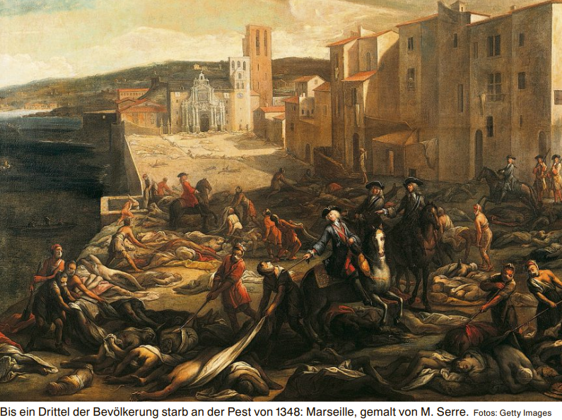 Nach der Grossen Pest gab es so etwas überhaupt nicht, was auch damit zu tun hat, dass damals totale Erschöpfung herrschte: Wir können uns die Angst kaum vorstellen, in der die Menschen damals gelebt haben müssen. Denn es starb ungefähr ein Viertel bis ein Drittel der Bevölkerung. Das ist eine Mortalitätsrate, die jene der Corona-Pandemie um ein Vielfaches übertrifft. Mit dem Abklingen der Pest kamen weite Bereiche des wirtschaftlichen und öffentlichen Lebens teilweise zum Erliegen.